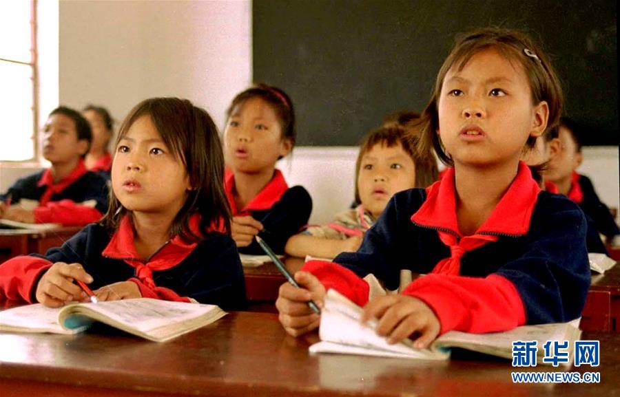 苦聰姐妹張民勒(前右,時(shí)年10歲)和張民松(前左,時(shí)年8歲)和同學(xué)們?cè)谠颇鲜≌呙奏l(xiāng)下納咪小學(xué)內(nèi)上課(資料照片)。新華社記者 藺以光 攝