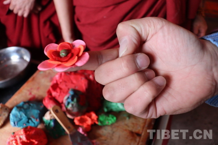 圖為僧人現(xiàn)場制作的酥油花 攝影:澤仁措姆