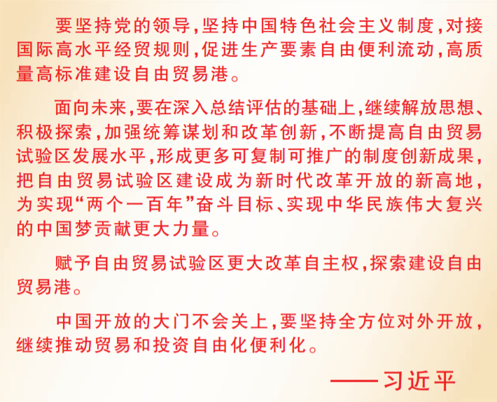 “建設(shè)自由貿(mào)易試驗區(qū)是黨中央在新時代推進(jìn)改革開放的一項戰(zhàn)略舉措,在我國改革開放進(jìn)程中具有里程碑意義?!?/p>