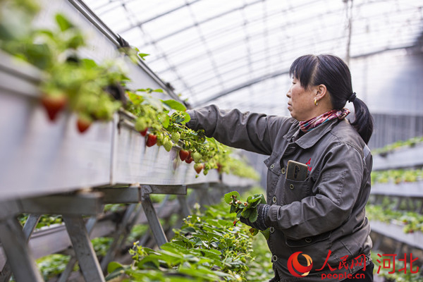 出香菇種植基地南行約3公里,就到了磁山二街的果蔬種植地。值守的工人趙師傅一按卷?yè)P(yáng)機(jī)按鈕,罩在外層的棚布徐徐卷起。推開(kāi)日光溫室大棚的門,沿著用水泥鋪墊的路走進(jìn)草莓采摘棚里,一陣夾雜著草莓香氣的暖風(fēng)迎面撲來(lái)。大棚內(nèi)一排排種植草莓的架子呈“A”字形,一壟壟草莓呈梯次立體排列。滴滴水珠通過(guò)智能滴灌系統(tǒng)潤(rùn)澤著秧苗,顆顆紅寶般的草莓令人饞涎欲滴,綠葉間點(diǎn)綴著朵朵小白花,蜜蜂嗡嗡嚶嚶穿梭其間。