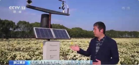 浙江桐鄉(xiāng)石門鎮(zhèn)某杭白菊種植基地負責人 謬悅嘯:這是一臺無線農業(yè)氣象綜合監(jiān)測站,它就像我們的眼睛,以前我們都是走到土地里面查看我們的一個種植情況,現(xiàn)在它能夠給我們檢測到光照、土壤、水分等信息,傳送到大數(shù)據平臺,來幫助我們預測氣象所帶來的一個病蟲害等問題,為我們杭白菊提質增效、保駕護航。