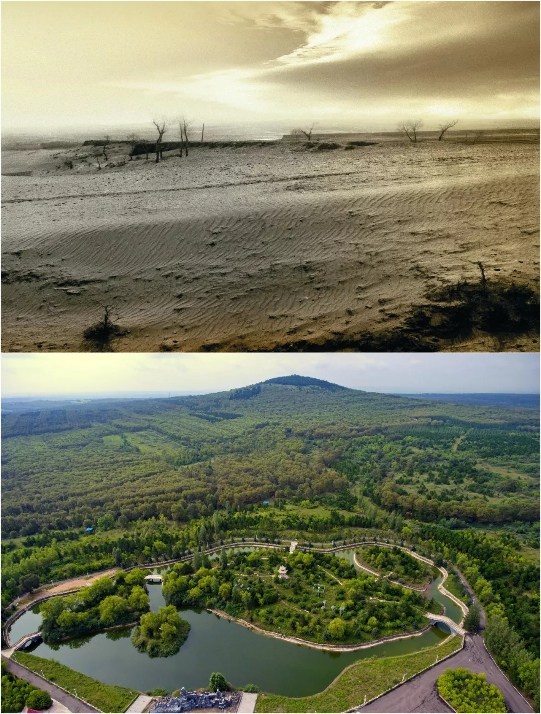 拼版照片:上圖為治理前,右玉縣的荒涼沙地(資料照片);下圖為右玉縣小南山森林公園(新華社記者曹陽8月7日攝)。