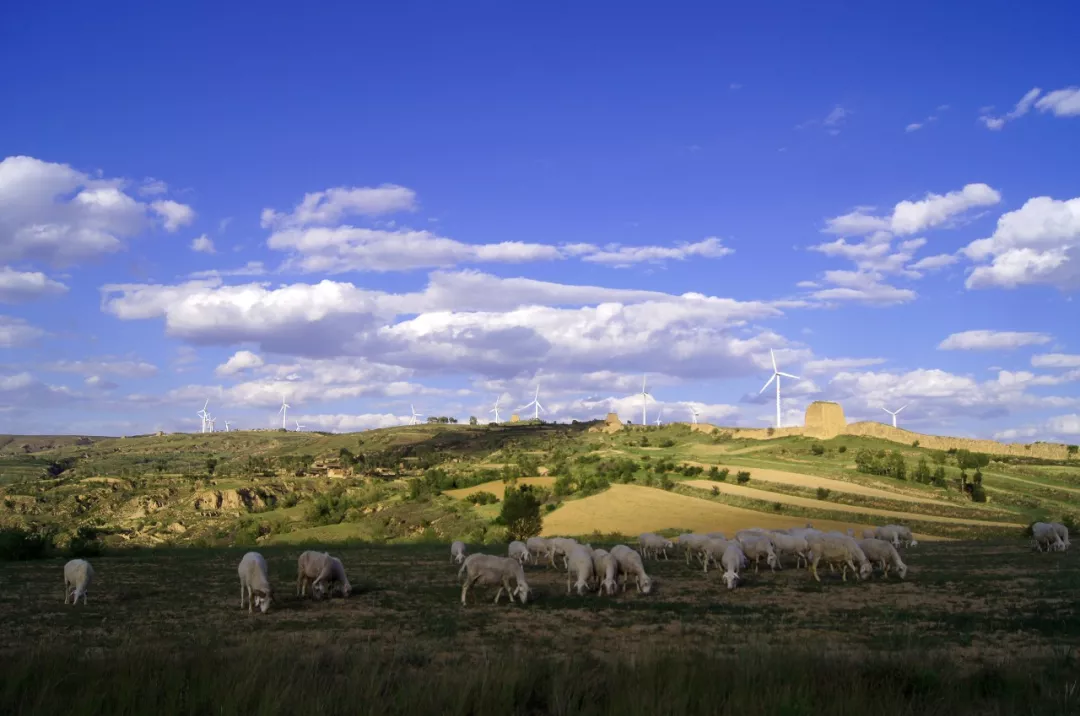 在山西省右玉縣小五臺風(fēng)力發(fā)電廠附近,當(dāng)?shù)啬撩穹硼B(yǎng)的羊群在吃草(2012年6月12日攝)。新華社記者 燕雁 攝