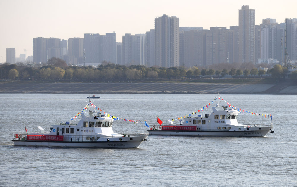 漁政執(zhí)法船隊從長江武漢段江面駛過,啟動長江流域重點水域“十年禁漁”(2020年12月31日攝)。新華社記者 程敏 攝