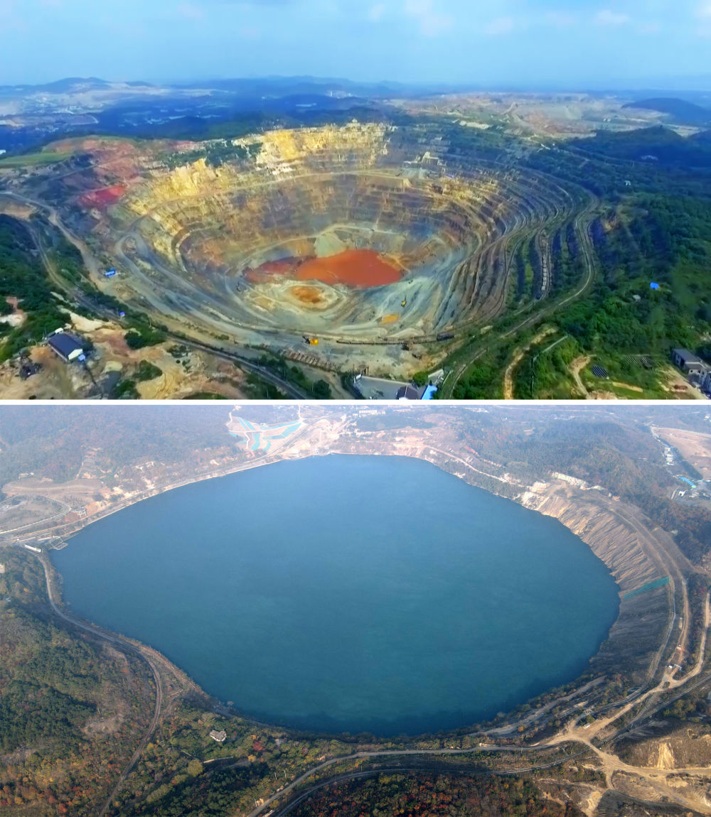 拼版照片:上圖為開采中的安徽省馬鞍山市雨山區(qū)向山鎮(zhèn)凹山采場(資料照片),下圖為生態(tài)修復后的凹山采場(新華社記者劉軍喜11月8日攝,無人機照片)。新華社發(fā)