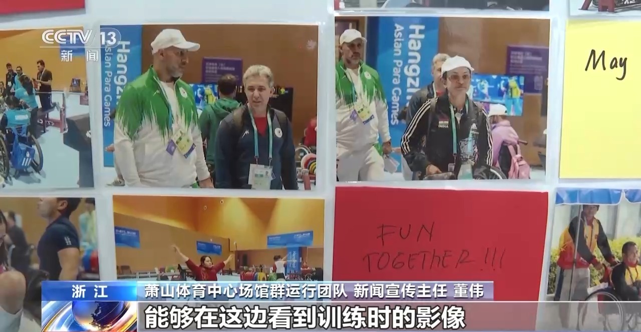 杭州蕭山體育中心體育館,是杭州第4屆亞殘運(yùn)會(huì)舉重項(xiàng)目的比賽場(chǎng)館,10月23日,舉重項(xiàng)目已經(jīng)在這里正式開賽。場(chǎng)館的工作人員為了給運(yùn)動(dòng)員放松心情,并鼓勵(lì)他們比賽,特意制作了一面照片墻。