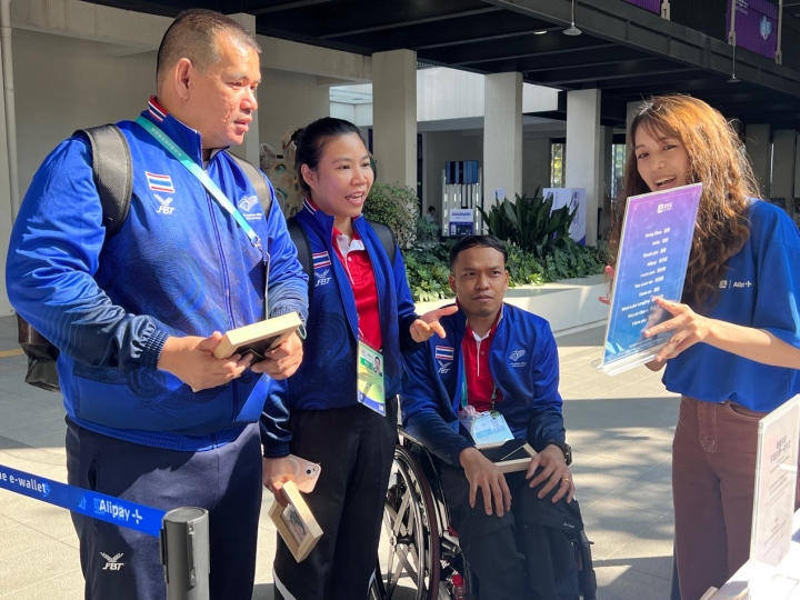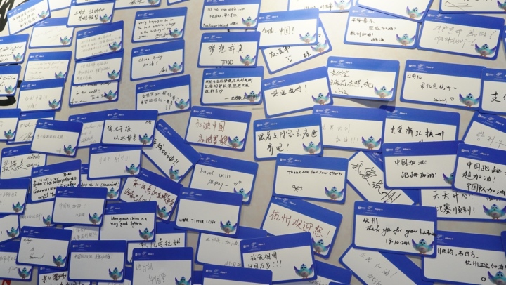 記者注意到,在體驗區(qū)現(xiàn)場的祝福墻上,貼滿了各國運動員和教練員們的祝福卡片。有的給自己和隊友加油,有的寫了來到中國參加亞殘運會的感受,其中提及最多的,是“謝謝杭州”、“我愛杭州”。