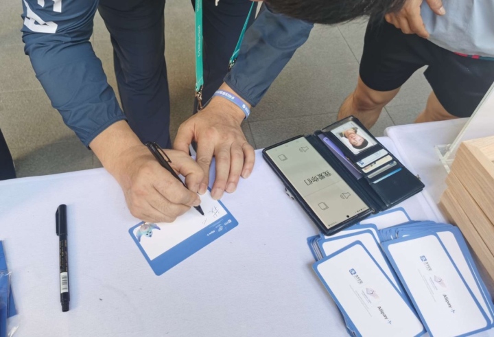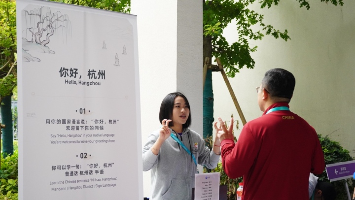 為了幫助各國運動員了解中國文化、了解杭州,體驗區(qū)現(xiàn)場設(shè)置了學(xué)中文趣味體驗環(huán)節(jié)。體驗者只要跟著志愿者現(xiàn)場學(xué)說十個諸如“杭州”、“西湖龍井”、 “片兒川”等簡單詞匯,或者學(xué)用手語打出相關(guān)詞匯,就可以獲得以西湖美景為主題的紀(jì)念徽章。