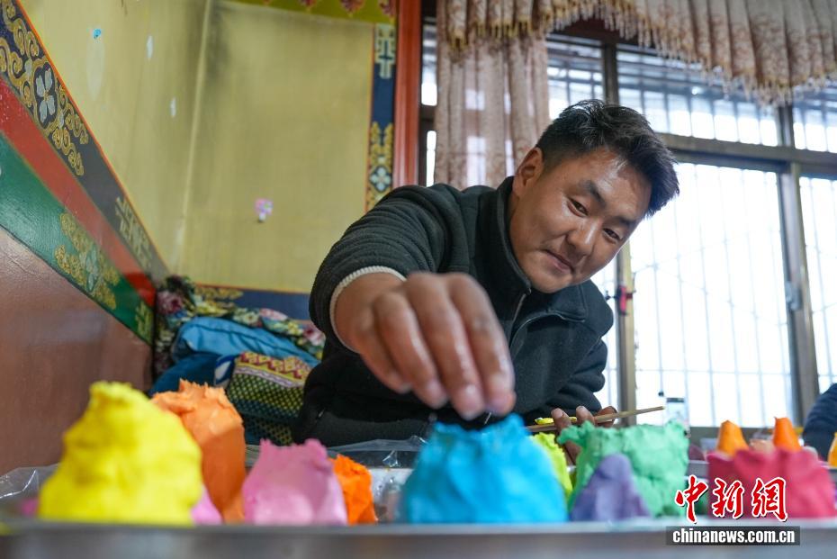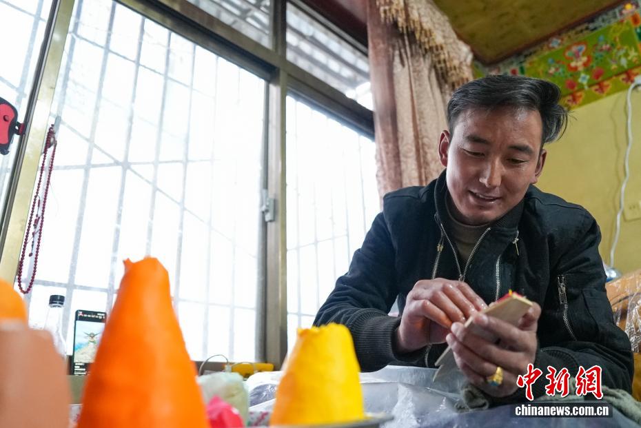2月4日,隨著藏歷新年臨近,拉薩街頭年味漸濃,年貨市場(chǎng)上的“孜扎”迎來(lái)熱銷。酥油花藏語(yǔ)稱“孜扎”,是藏歷新年吉祥物切瑪盒的重要組件,也是藏族民眾家中必備的年貨。酥油花以酥油為主要原料,由匠人純手工捏制而成,造型涵蓋佛像、人物、花卉樹(shù)木、飛禽走獸等,常見(jiàn)圖案包含吉祥八寶、和諧四瑞、長(zhǎng)壽圖等,承載著藏族民眾對(duì)新年平安吉祥、萬(wàn)事順?biāo)斓拿篮闷碓浮D為手工藝人在制作酥油花。貢確 攝