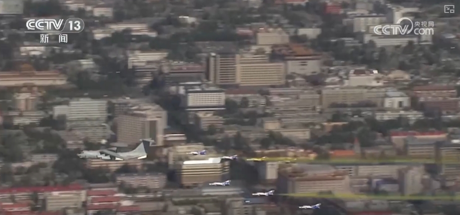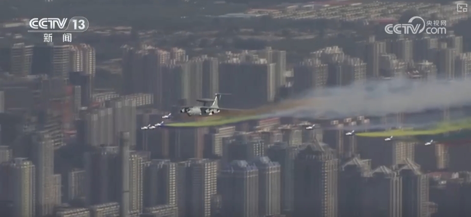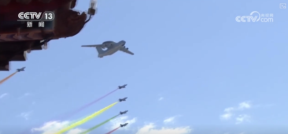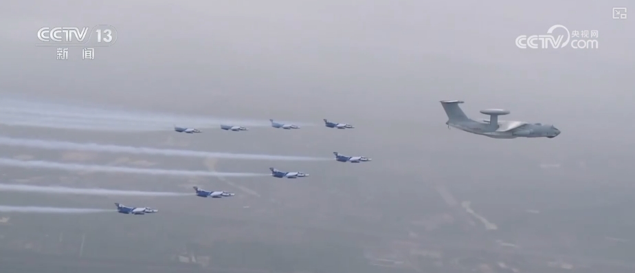 這是2009年10月1日,新中國(guó)成立60周年閱兵式上,機(jī)群飛過(guò)天安門廣場(chǎng)的壯觀場(chǎng)景。領(lǐng)航機(jī)型是我國(guó)自主研發(fā)的預(yù)警機(jī)空警2000和空警200,這也是中國(guó)預(yù)警機(jī)第一次在全球觀眾面前公開亮相。