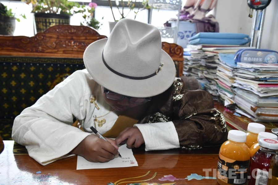 圖為噶嗎多吉為王成誠同學寫信 攝影:趙振宇