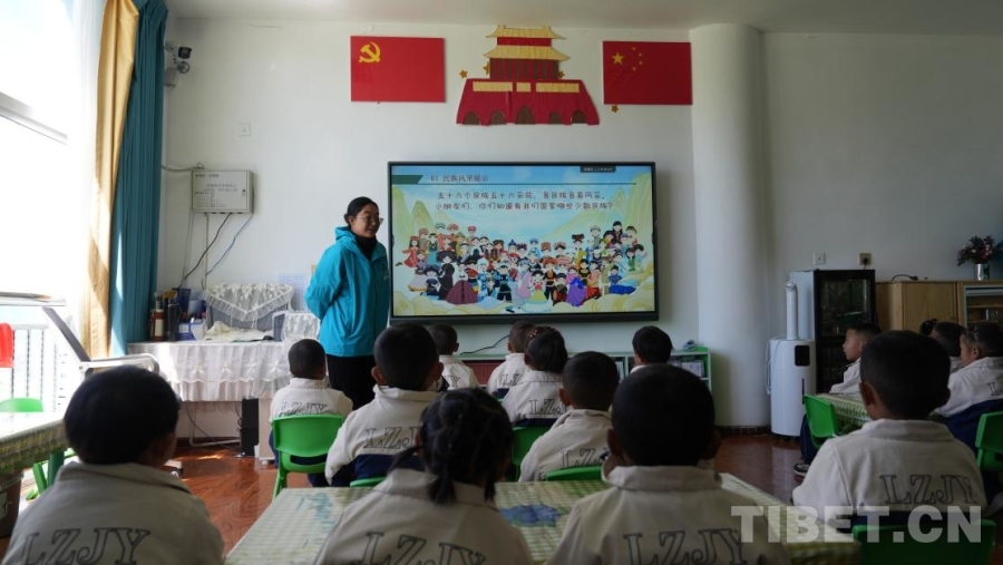 在西藏日喀則市拉孜縣第二幼兒園中(1)班教室里,老師郁瓊珠姆話音剛落,孩子們的回答便齊聲響起,清脆而堅定。屏幕上,56個民族的卡通形象匯聚于一幅畫之中。她接著問道:“那我們國家遼闊的土地上,生活著多少個民族?”一只只小手高高舉起,搶答聲此起彼伏:“56個!”對孩子們而言,這些答案已經(jīng)成為日常學(xué)習(xí)生活中耳濡目染的常識。