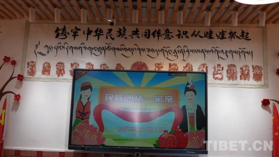 幼兒園主教學(xué)樓內(nèi)懸掛著一幅書法作品,上面寫道:“鑄牢中華民族共同體意識從娃娃抓起?!闭驗樯钤诿褡褰煌涣鹘蝗诘默F(xiàn)實環(huán)境中,了解各民族和睦相親的真實故事,這里的孩子們才能在第一時間毫不猶豫地回答出五十六個民族是一家,才能從心底認(rèn)同中華民族是我們共同的名字。中華民族共同體意識正在一代又一代娃娃的心中萌發(fā)新芽、深深扎根。(中國西藏網(wǎng) 實習(xí)記者/宋俊)