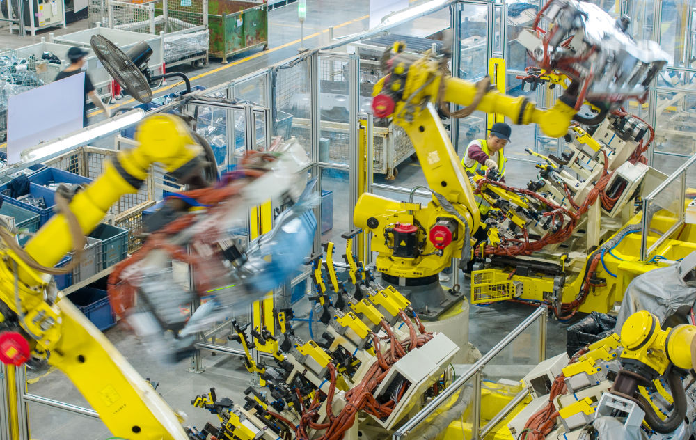 浙江省湖州市長興經(jīng)濟技術開發(fā)區(qū)的長興地通汽車部件有限公司技術人員操控工業(yè)機器人生產(chǎn)新能源汽車配件(無人機照片,2025年10月9日攝)。新華社發(fā)(譚云俸 攝)