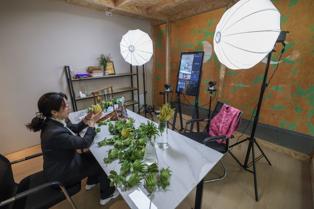 在浙江金華市金東區(qū)赤松鎮(zhèn)北山口村的金華佛手農(nóng)林服務中心內(nèi)的直播間,工作人員進行佛手鮮果及衍生產(chǎn)品的直播銷售(2025年10月22日攝)。新華社記者 徐昱 攝