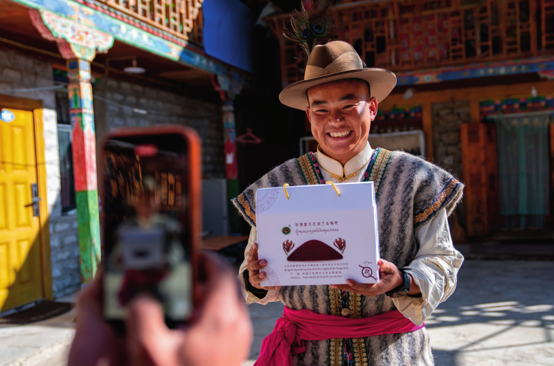 在西藏日喀則市定結(jié)縣陳塘鎮(zhèn),自媒體博主夏爾巴人旦增在拍攝視頻推介當?shù)靥禺a(chǎn)雞爪谷糌粑(2024年12月13日攝)丁增尼達攝/本刊